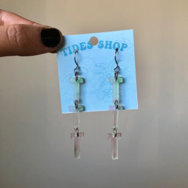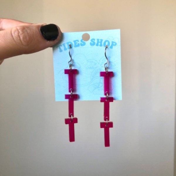 par de aros con dije de acrílico, anzuelo de acero quirúrgico y frufru de silicona