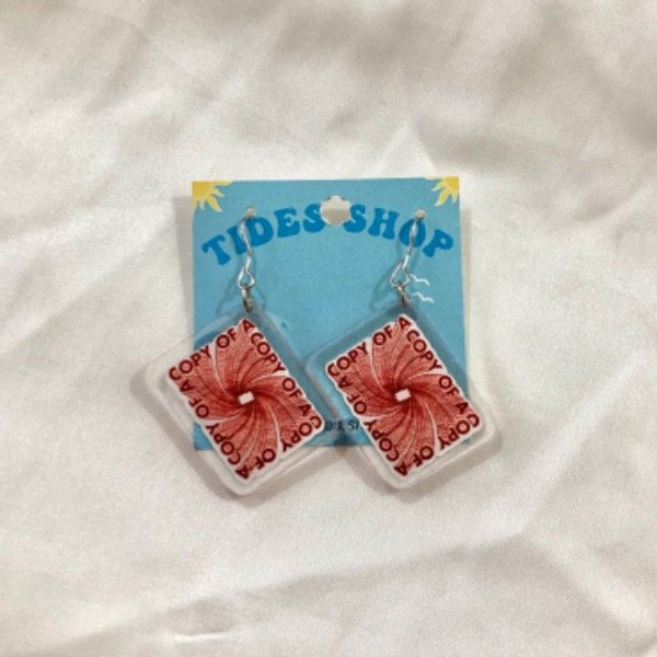 Par de aros con anzuelo de acero quirúrgico, dijes de acrílico sublimado en vinilo y frufru de silicona.